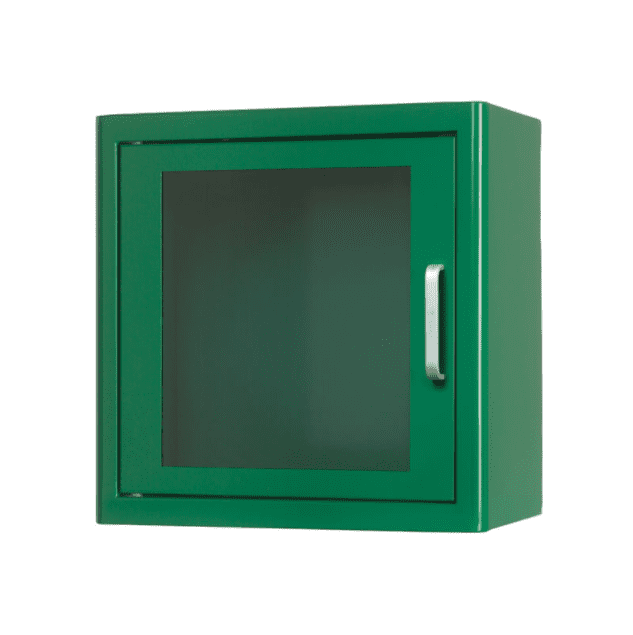Groene ARKY AED binnenkast met alarm, geschikt voor alle merken. Deze kast biedt voor elke AED in de markt de ideale opbergoplossing.